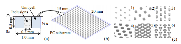 图2 (a)通用单元;(b)在聚碳酸酯(PC)基质中构建带有单位细胞(内含物)的人工样品;(c)若干单元格的例子:球体、立方体、圆柱体、圆盘、矩形网、圆盘+圆柱体(由电介质或金属制成)。