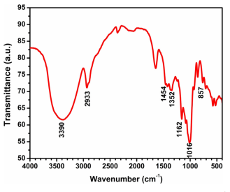 通过傅里叶变换红外光谱(FT-IR)对化学外加剂进行表征,结果显示在3300 cm⁻¹处出现宽峰,对应羟基(-OH)的伸缩振动。2933 cm⁻¹处的弱吸收带归属于C-H伸缩振动,1454-1372 cm⁻¹之间的吸收峰为淀粉环骨架振动,1016-1062 cm⁻¹区间的吸收由C-O伸缩振动引起,857 cm⁻¹处的弱峰则对应C-O-C伸缩振动。