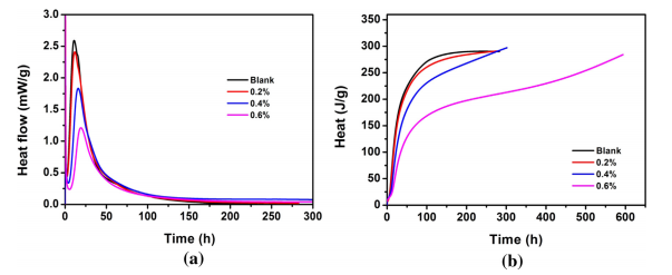 通过等温量热法研究不同掺量SA对水泥水化过程的影响。实验结果显示,化学外加剂的加入显著改变了水化反应速率和程度。当SA掺量从0.2%增加至0.6%时,最大热流从2.6 mW/g降低到1.5 mW/g,表明水化放热速率得到有效控制。
