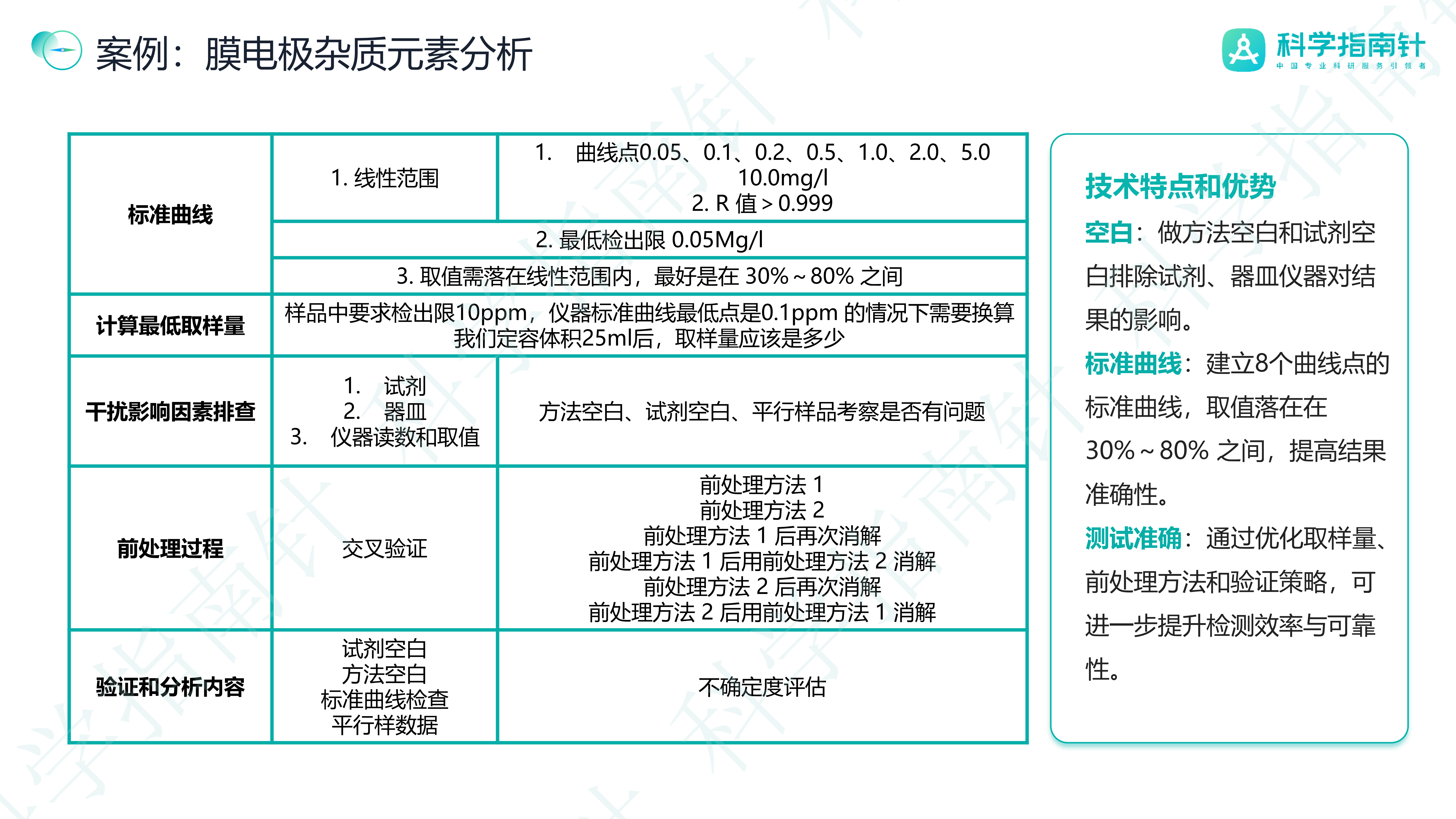 【摘要】 科学指南针依托 ICP-OES 设备,实现膜电极 Al/Cr/Fe/Ni 等杂质 10ppm 级精准检出,优化消解工艺避免干扰,提供杂质含量数据与来源排查建议,适配量产质控与科研纯度分析。