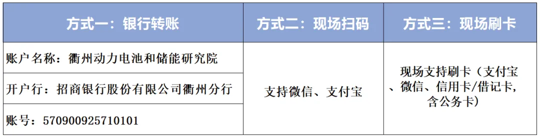 会议参会代表需通过银行转账/现场扫码/现场刷卡进行会议费缴纳,并完善发票及其他相关信息。相关会务接待、预订住宿等由衢州市人才科创集团有限公司提供服务,发票由衢州动力电池和储能研究院开具。