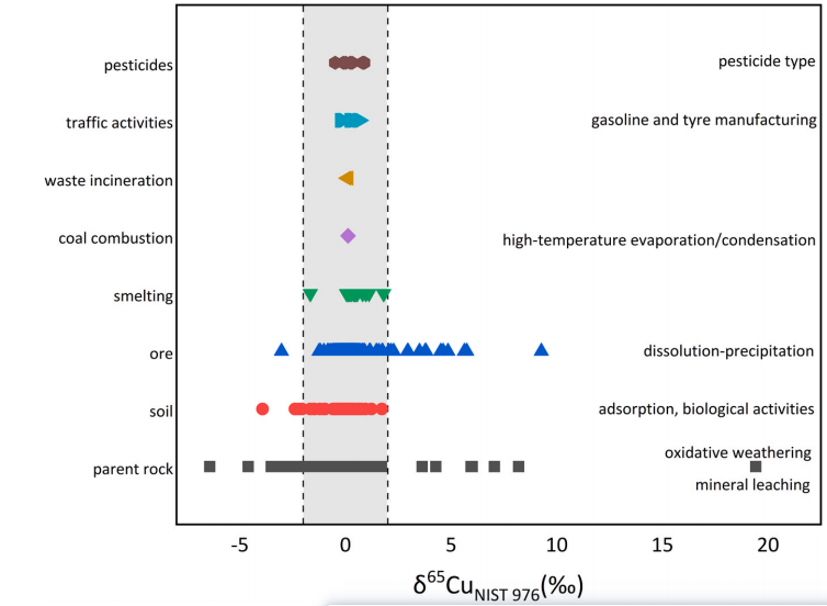 图1. 环境样品中Cu同位素特征的变化。[1]