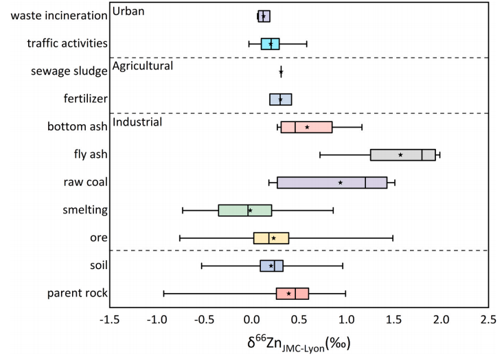 上图展示了铜(Cu)同位素在环境样品中的特征变化,突显了同位素信号在源分配中的实用性。类似地,锌(Zn)同位素比值在不同样品中也呈现显著差异,这为多元素源的同时识别提供了依据。