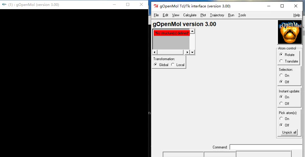 将gOpenMol解压后,进入D:\gOpenMol-3.00\bin目录下,双击rungOpenMol.bat文件,即可打开gOpenMol的可视页面。
