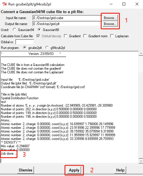 点击菜单栏Run-gCube2plt/g94cub2pl (cube),通过“Browse”选择输入、输出文件,之后点击“Apply”,在出现“Job done”时,即转化完成,可看到生成了.plt文件和.crd文件。