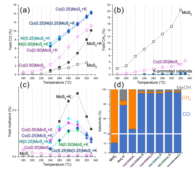 图3 几种MoS2基催化剂在21 bar,20% CO2, 60% H2和20% He条件下的催化活性。(a) CO的产率,(b) CH4的产率,(c)甲醇的产率,(d) 280℃下的选择性。