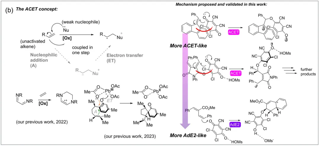 本研究项目包含机理假设、计算验证和实验表征,系统揭示了 DDQ 促进缺电子烯烃反应中的全新反应机理——加成耦合电子转移(addition-coupled electron tranfer, ACET)机制,对沿用数十年的传统单电子转移(single electron transfer, SET)反应机理提出了创新修正。