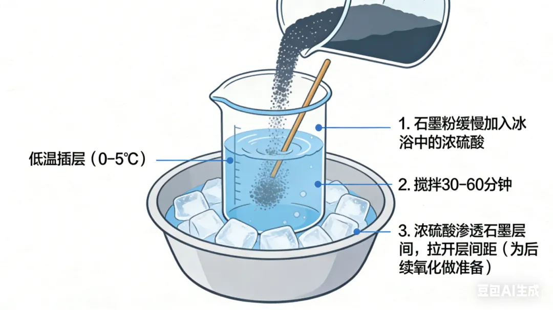○低温插层(0-5℃):将石墨粉缓慢加入冰浴中的浓硫酸,搅拌30-60分钟,让浓硫酸充分渗透到石墨层间,拉开层间距(为后续氧化做准备);