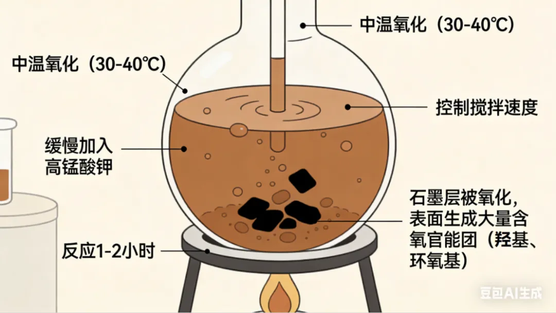 ○中温氧化(30-40℃):缓慢加入高锰酸钾,控制搅拌速度,反应1-2小时,此时石墨层被氧化,表面生成大量含氧官能团(羟基、环氧基),颜色逐渐变为棕褐色;