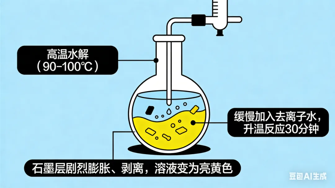 ○高温水解(90-100℃):缓慢加入去离子水,升温反应30分钟,石墨层会剧烈膨胀、剥离,溶液变为亮黄色;