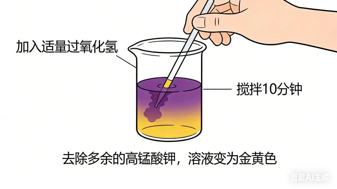 ○终止反应:加入适量过氧化氢,搅拌10分钟,去除多余的高锰酸钾,溶液变为金黄色;