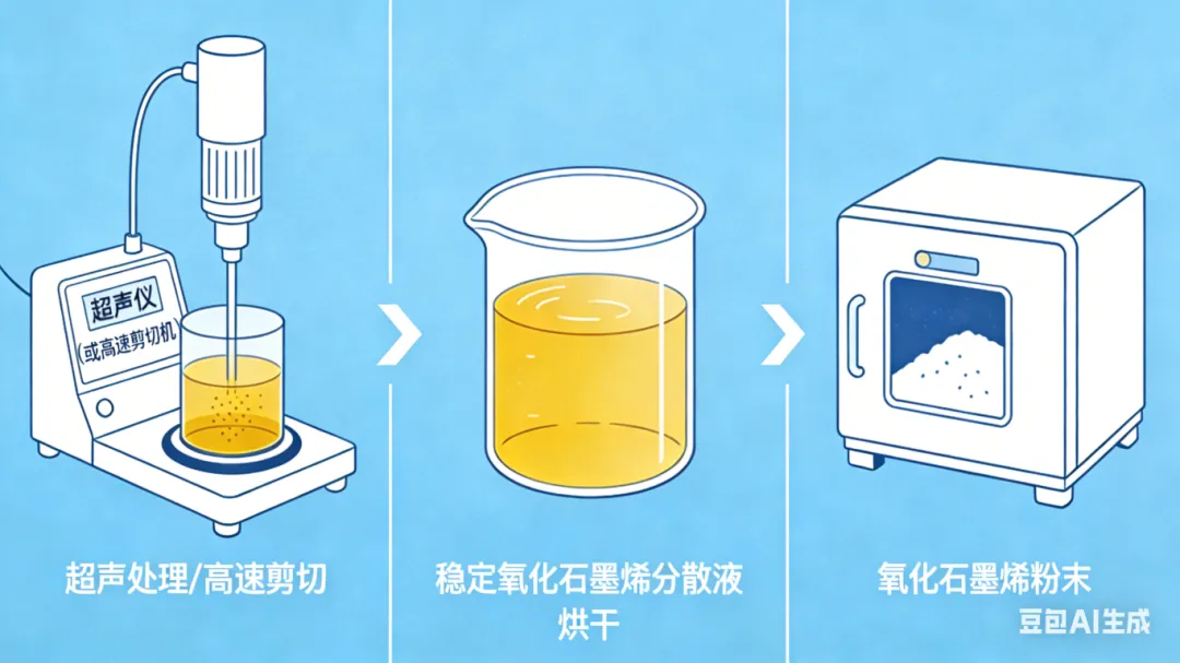 ○剥离分散:将提纯后的产物超声处理(或高速剪切),得到稳定的氧化石墨烯分散液,烘干后可得到氧化石墨烯粉末。