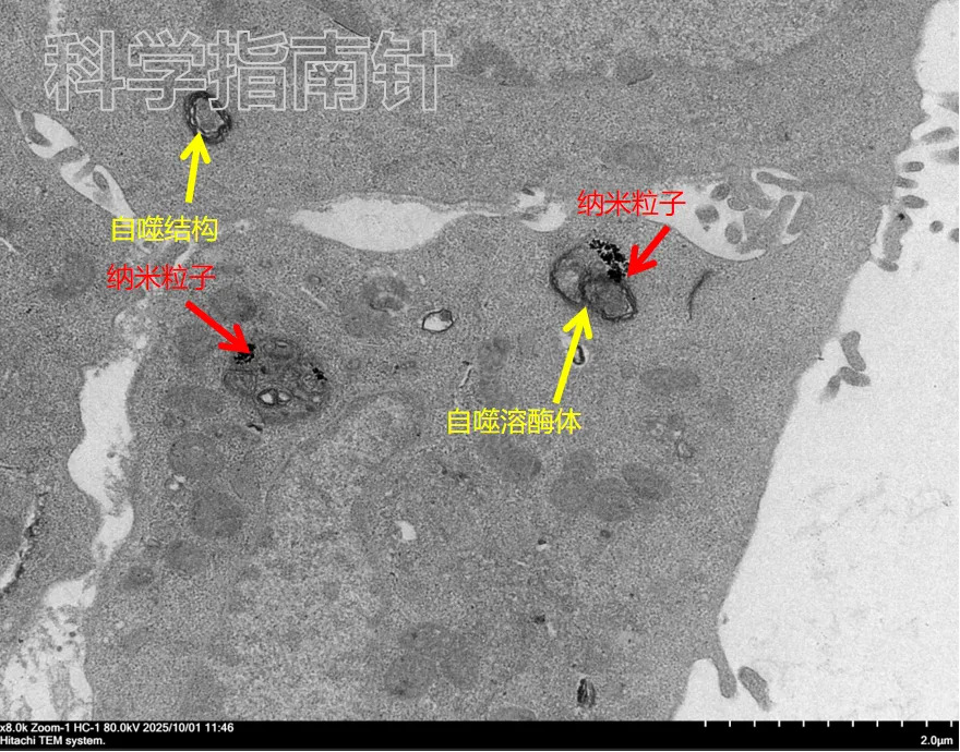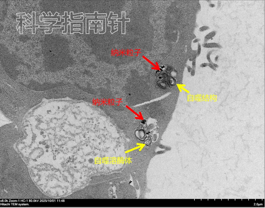 在TEM图像中,还常常能观察到 自噬结构(autophagosome) 的出现。这说明细胞可能已经启动了 自噬或降解通路,试图处理这些进入细胞的纳米材料。