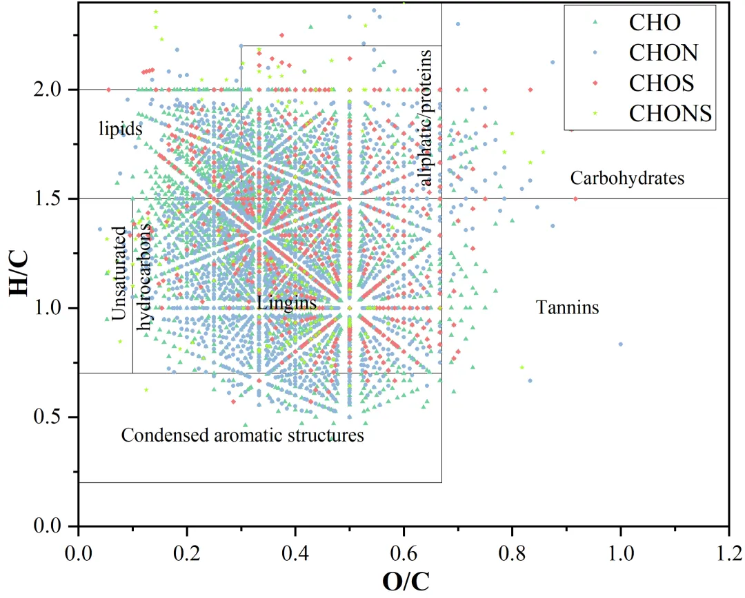 以 H/C、O/C 为坐标轴,可快速区分腐殖质、脂肪族、蛋白质类等物质类型,是 DOM 来源解析的核心图表。